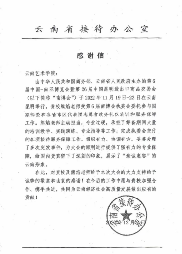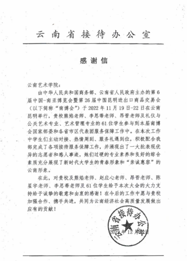 第6届中国—南亚博览会暨第26届中国昆明进出口商品交易会(以下简称“南博会”)于2022年11月19日-22日在昆明滇池国际会展中心举行。英国威廉希尔英文官网熊焰老师、赵应心老师、昂晋老师、陈星宇老师、李思蒂老师及礼仪与公关艺术专业、艺术管理专业的61位员工参与到本届南博会志愿服务工作中,为南博会圆满召开做出了积极贡献。