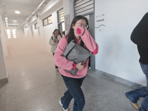 本次演练模拟教学楼发生火灾,随着教学楼区域突然升起的模拟浓烟和紧急广播警报响起,正在上课的师生们迅速用湿毛巾或衣袖捂住口鼻,保持低姿势弯腰前行,沿着指定的安全疏散路线,快速而有序地向楼外空旷地带撤离,整个过程紧张而有序。