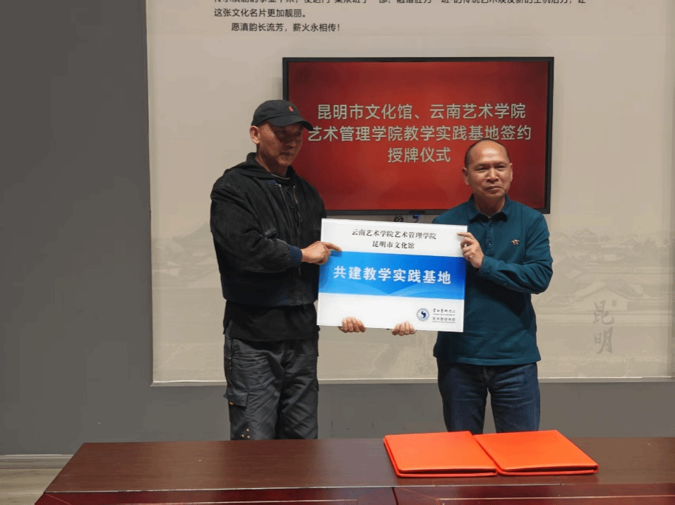 交流结束后,双方领导共同签署了教学实践基地合作协议,英国威廉希尔英文官网领导向昆明市文化馆授“共建教学实践基地”牌匾,标志着馆校正式建立合作关系。双方将以此平台,在开展校外教学、实习实践、文旅志愿服务等方面进行合作。