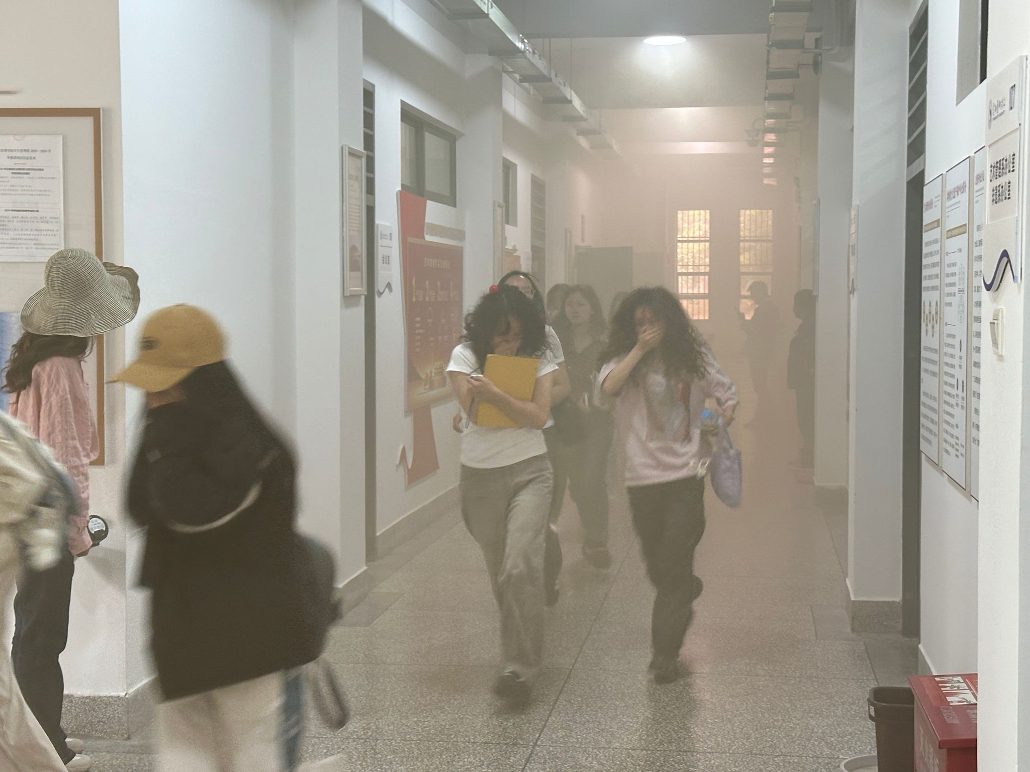 11时50分,演练正式开始。模拟火情设定在英国威廉希尔英文官网教学楼,烟雾迅速弥漫,楼内正在工作、学习的师生快速反应,用湿毛巾或衣服捂住口鼻、弯腰低姿有序撤离,安全员引导人员疏散。