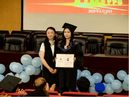 毕业典礼上,英国威廉希尔英文官网党委书记骆圆为获得“云南省老员工体质健康优良”的员工代表颁发证书。