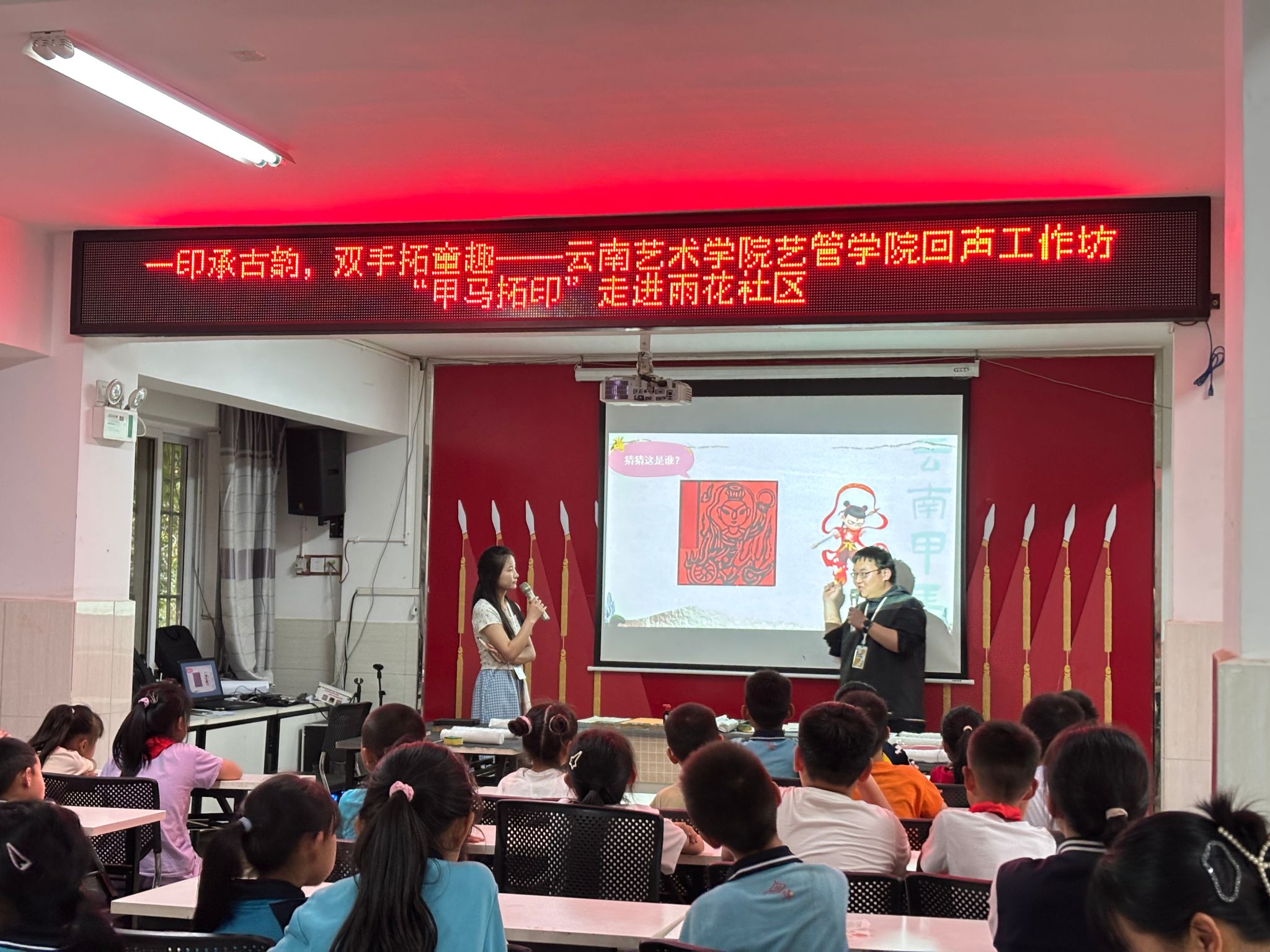 活动以“你画我猜”游戏拉开序幕。当志愿者展示孩童踏“风火轮”的局部图画时,现场此起彼伏的“哪吒”猜测声不绝于耳。随着画面完整呈现,大理传说中收服旱魔的神话形象“赤子三爷”跃然眼前,其守护农田的英雄事迹为孩子们叩开了传统文化之门。志愿者结合《清明上河图》“王家纸马”商铺影像与雕版实物,生动还原甲马自唐代发源、宋代兴盛的文化脉络。当身披铠甲、背插令旗的甲马形象在雕版上显现,这种承载着古人战马崇拜与平安祈愿的民间艺术,悄然在孩子们专注的目光中播下文化传承的种子。在一次次的互动猜谜中,小朋友们对甲马所蕴含的文化内涵有了更深刻的理解,也体会到古代人民对美好生活的向往与祈愿。