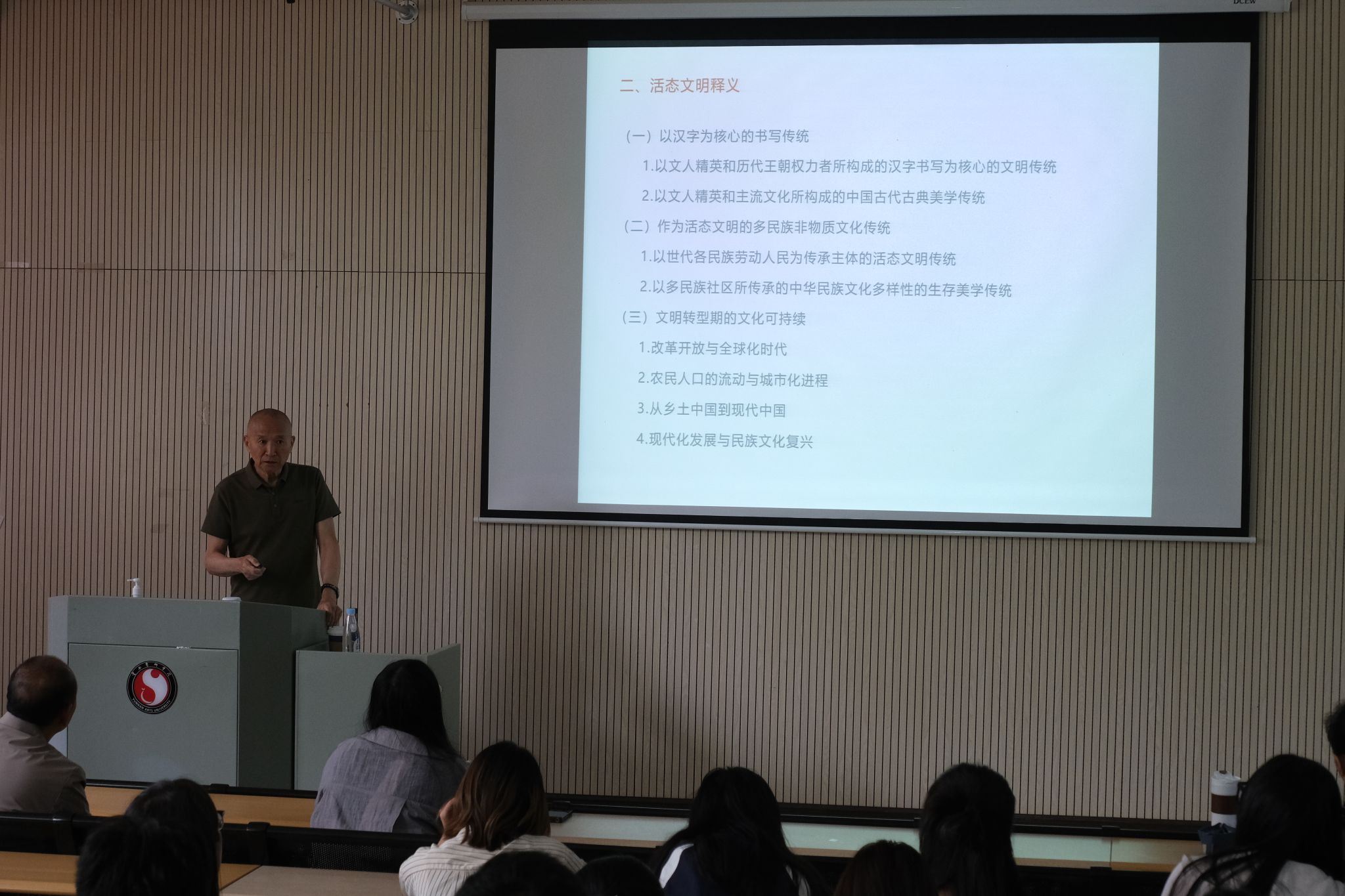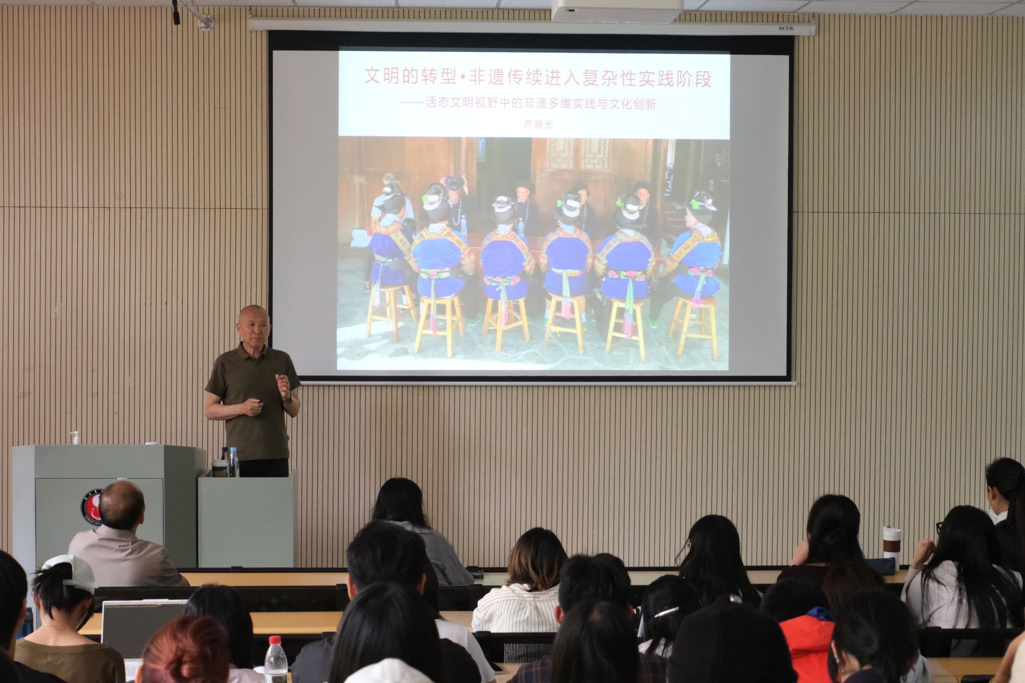 讲座中,乔晓光教授还融合日常生活实践理论、即兴实践与复杂实践的思维框架,借助丰富的田野案例,深入解析了非物质文化遗产在多重场景中的复杂互动。他指出:“一个区域的文化创新,不仅应关注现有的文化形态,还应考虑其背后更广阔的地缘文明背景。人才的培养与成长,既根植于社区群体文化的基础,也深受一方水土所孕育的文化底蕴影响。发展的机遇不仅存在于艺术类型和行业领域之中,更深层次的发展动力与灵感,则来源于时代生活本身以及文明积淀中的智慧。”