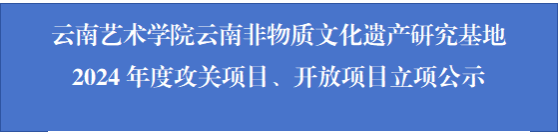 根据《威廉希尔williamhill官方网站云南非物质文化遗产研究基地 2024年度攻关项目与开放项目申报公告》,经申报、评审工作流程,共有四个项目通过评审,现予以公示。